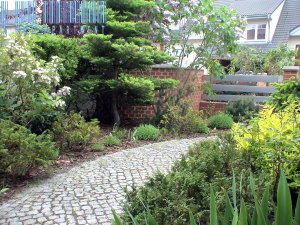 W opisywanej nieruchomości szczególną jej część stanowią obydwa ogrody, które z uwagi na ogólną koncepcję zabudowy działki /210 m2/ i ciekawe ukształtowanie bryły budynku, jawią się bardziej jako integralna część architektury, niż jako osobna forma zagospodarowania terenu. I tak ogród frontowy jest niejako otwartą przestrzenią wejściowego hallu a ogród na zapleczu, wraz z poprzedzającym go tarasem, stanowi optyczne przedłużenie wielkiego salonu.