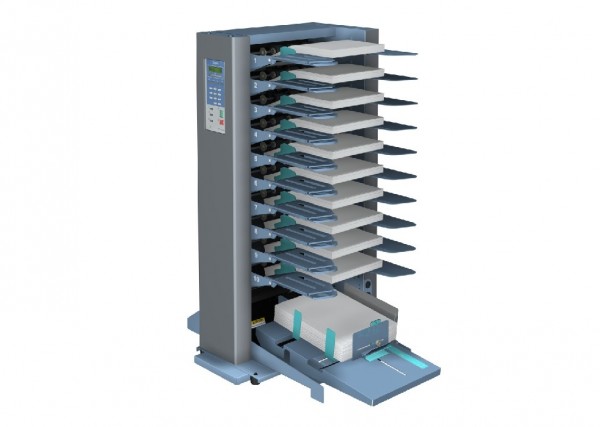 10-półkowa zbieraczka cierna DFC-100 stanowi niezawodne i efektywne kosztowo rozwiązanie dla niewielkich drukarni i punktów usługowych. Model ten może być rozbudowany do 20 półek (2 zbieraczki). Zbieraczka może być podłączona do agregatu szyjąco-falcującego DBM-120, tworząc system do produkcji broszur.