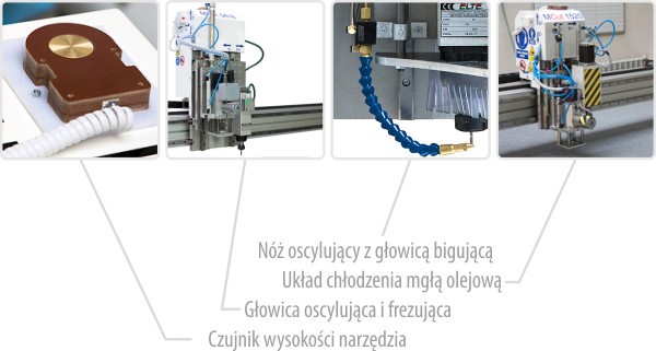 Korzyści: Czujnik wysokości narzędzia Panel operatorski - manipulator z wyświetlaczem LCD Układ chłodzenia sprężonym powietrzem Układ chłodzenia mgłą olejową Układ odciągu wiórów Głowica ELTE do 1 kW Głowica ELTE do 0,8 kW Stół pods