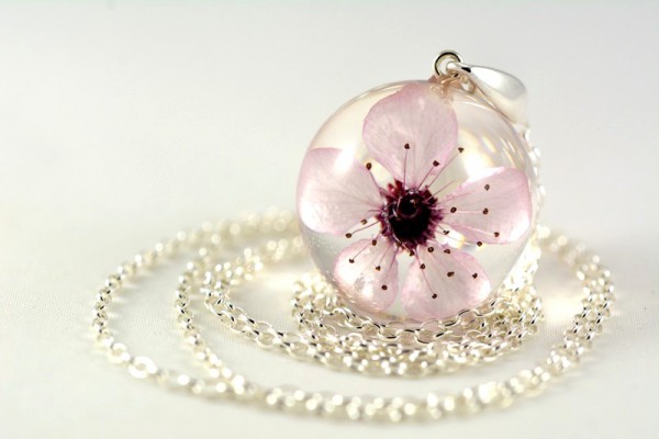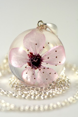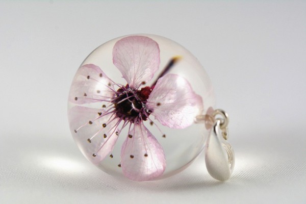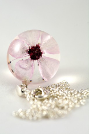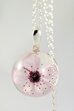 Materiały: kwiat wiśni, żywica, srebro próby 925.