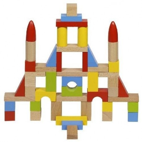 Zestaw pięćdziesięciu kolorowych klocków o różnych kształtach. Zabawa klockami rozwija wyobraźnię, dzięki czemu można do nich wracać bez końca bez obawy, że się znudzą.