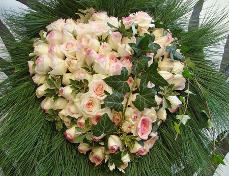 Kompozycja pogrzebowa w formie serca, z żywych kwiatów.