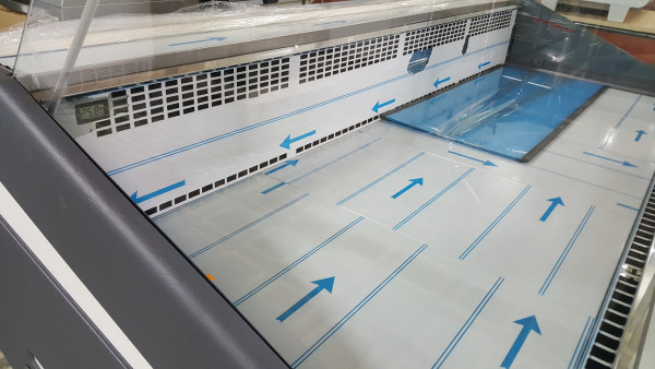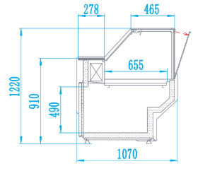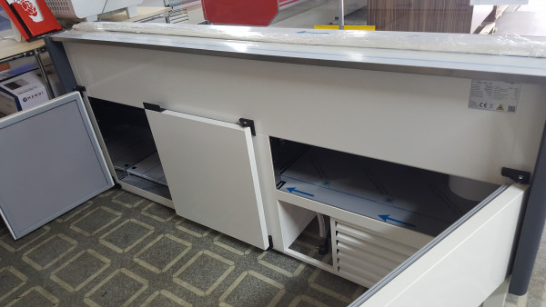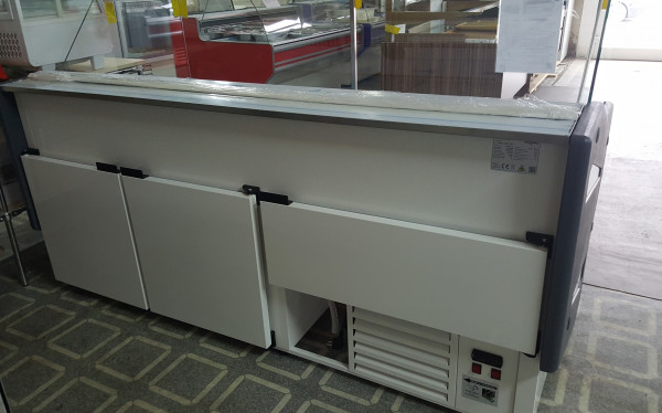 Lada chłodnicza z szybą prostą pionową, ozdobnym i praktycznym blatem ze stali nierdzewnej wzorkowanej „płótno”, przechowalnikiem o zwiększonej pojemności pozwalającej na pomieszczenie 6 pojemników Euro 2 (60x40x20), bokami z HIPS wypełnionymi pianką poliuretanową, osłoną stopek oraz podświetleniem LED