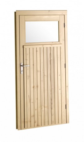 Drzwi jednoskrzydłowe HDE14G to drzwi wykonane z wysokiej jakości świerku skandynawskiego, nieimpregnowane i niemalowane. Posiadają otwór w górnej części skrzydła wypełniony szybą przeźroczystą 4 mm. Drzwi wyposażone są w: zamek patent, wkładkę, komplet kluczy, klamkę i szyld.