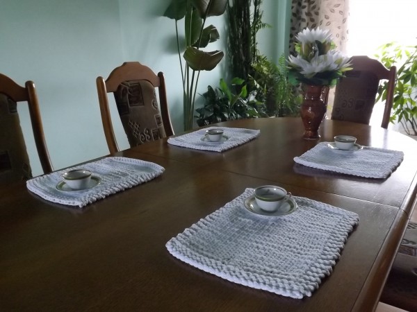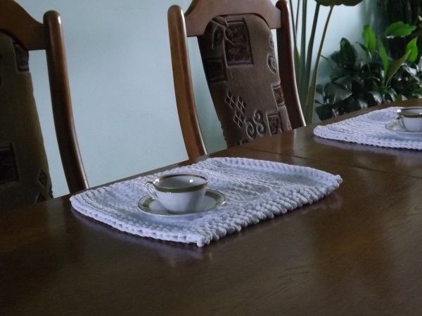Oferuję oryginalne piękne podkładki na stół.Podkładki zrobione ręcznie na drutach ze sznura bawełnianego numer 3 mm.Po bokach zastosowano wzór francuski i gładki.Rozmiar podkładek 30 cm na 40 cm.Piękna ozdoba stołu,lub idealny prezent.Można prać w temperaturze 30 stopni w pralce lub ręcznie.Nie wymaga krochmalenia.Zapraszam Państwa do zakupu i polecam gorąco