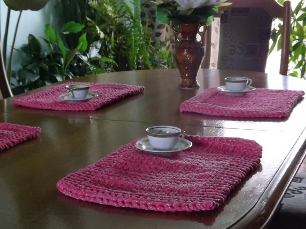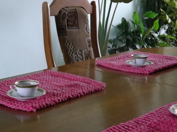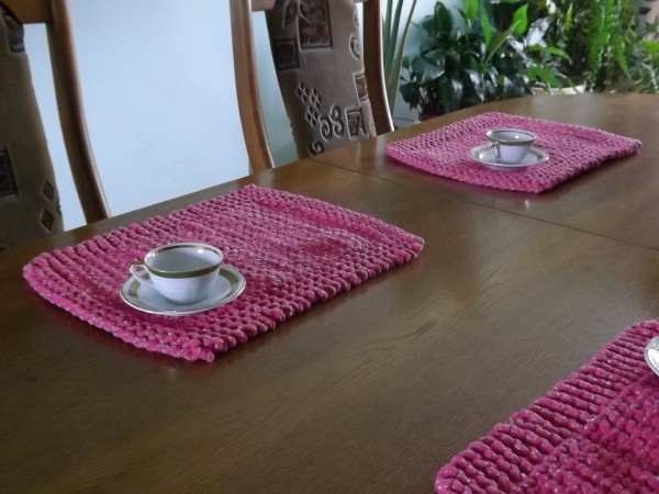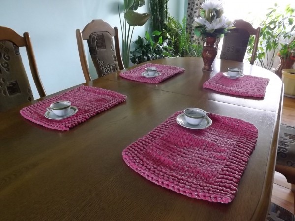 Elegancki komplet podkładek na stół.Podkładki robione na drutach w kolorze ciemno różowym.Zestaw zawiera cztery sztuki.Wielkość 30 na 40 cm.Idealnie nam pasują jako dodatek do salonu,jadalni lub na prezent.Można prać w pralce w 30 stopni Celsjusza lub ręcznie.Nie mechacą się,i nie rozciągają się.Bardzo łatwo utrzymamy je w czystości.Nie wymaga żadnego krochmalenia.Ma właściwości antyalergiczne