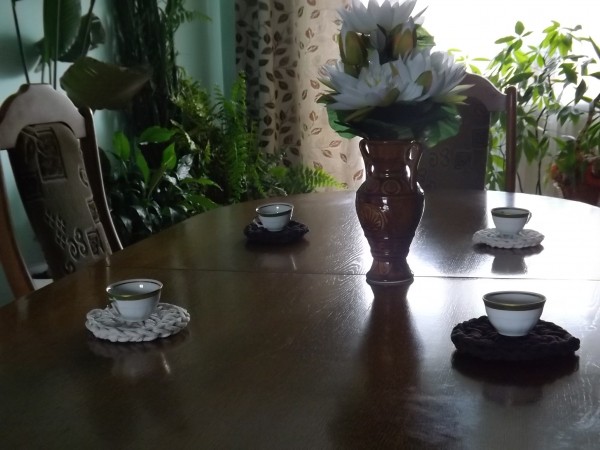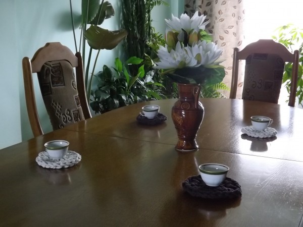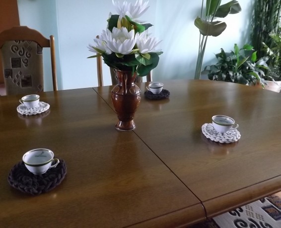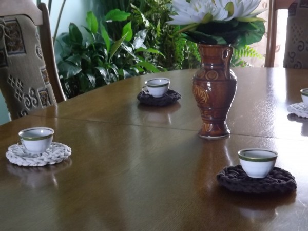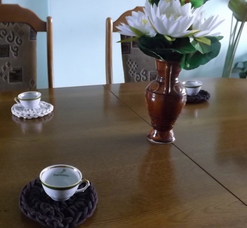 Małe okrągłe podkładki na stół robione na szydełku ze sznura bawełnianego.Zastosowano dwa kolory jasno beżowy i ciemno brąz.Średnica 12 cm.W zestaw wchodzi cztery sztuki.Idealnie pasują do salonu.Można prać w pralce w 30 stopni Celsjusza lub ręcznie.nie mechacą się i nie rozciągają się.Ma właściwości antyalergiczne.Zapraszam Państwa na zakupy