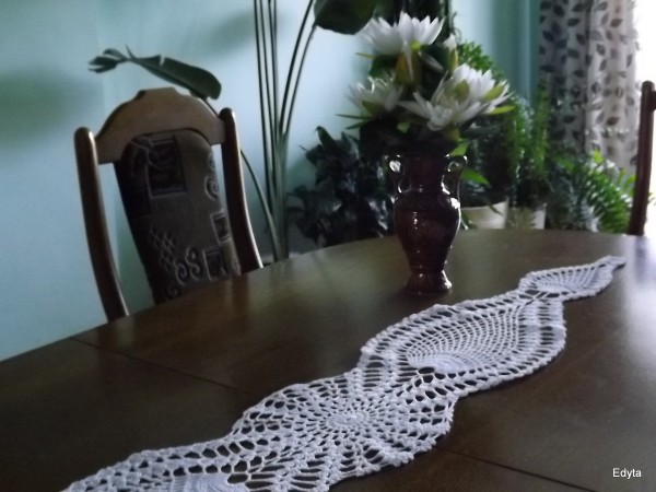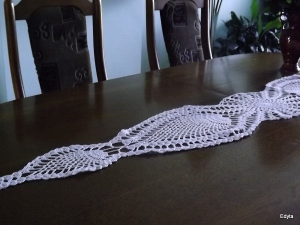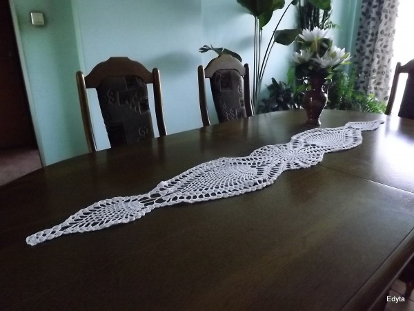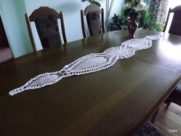 Serweta podłużna w kolorze białym.Robiona na szydełku z wysokiej jakości nici bawełnianych Muza.Jest to doskonała jakość ,gdzie możemy prać w pralce lub ręcznie.Serwetę należy lekko krochmalić.Ma ciekawy splot ananasy i pięknie komponuje się w salonie na dużym owalnym stole.Rozmiar serwety długość 160 cm,szerokość 25 cm.Swoim kształtem i ciekawym wzorem będzie zdobiła nasz salon.Polecam gorąco paniom i zapraszam na zakup