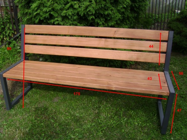 Wymiary ławki: szerokość 175cm, wysokość 90 cm, głębokość 43 cm, wysokość siedziska 47 cm.