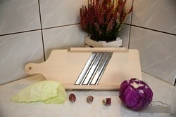 Tarka do warzyw wykonana z drewna. Posiada 3 niklowane noże, co zapobiega przed korozją i wydłuża żywotność przedmiotu.