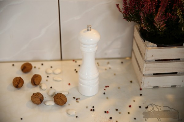 Drewniany lakierowany młynek pieprzu posiadający ceramiczny mechanizm mielący.