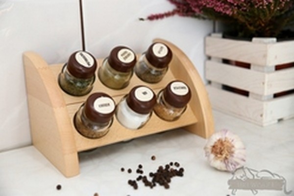 Drewniany organizer posiada 6 słoiczków na przyprawy umieszczonych na półeczce, która można postawić na blacie kuchenny.
