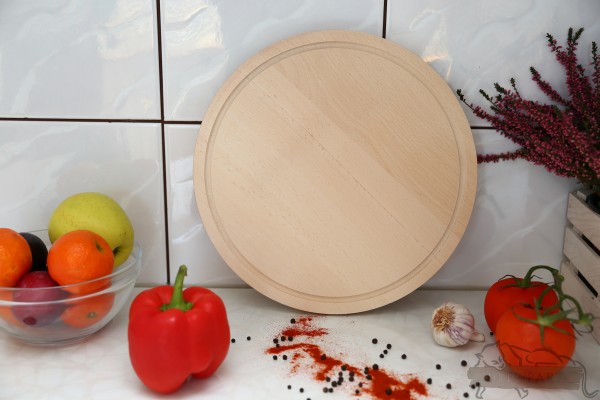 Duża drewniana deska kuchenna z rowkiem o średnicy 30cm. Deska posiada rowek odprowadzający płyny z deski. Deska wykonana z drewna bukowego. Możemy nanieść na nią grawer logo Twojej firmy. Podana cena jest ceną detaliczną.