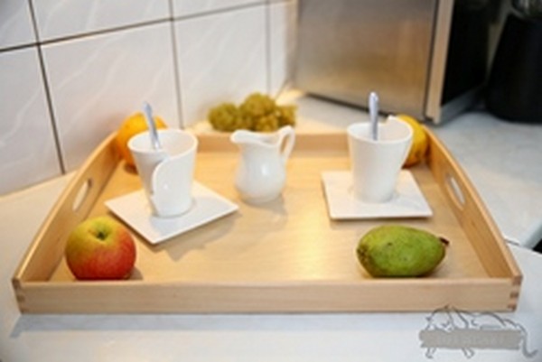 Duża drewniana taca na szklanki w trzech kolorach wykonana została z drewna bukowego. Jest przydatnym produktem wykorzystywanym do przenoszenia naczyń z jedzeniem lub napojami w lokalach gastronomicznych czy barach.