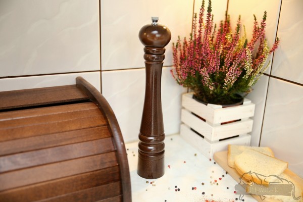Duży drewniany lakierowany młynek pieprzu z ceramicznym mechanizmem mielącym. Młynek wykonany z drewna bukowego dodatkowo zabezpieczony lakierem.
