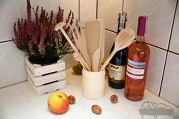 Drewniane przybory kuchenne oraz kubek w którym one się znajdują wykonane zostały z drewna bukowego.