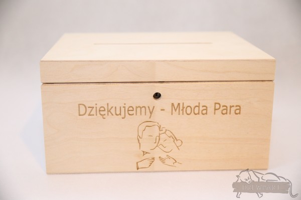 Drewniane pudełko na koperty wykonane z drewna sosnowego. Pudełko posiada otwór do wrzucania kopert oraz zamek na kluczyk.