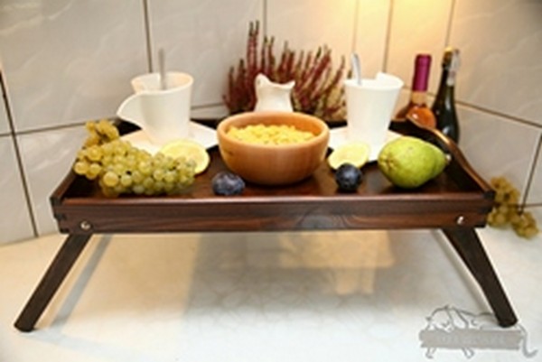 Drewniana taca przydatna podczas serwowania śniadania do łóżka kochanej osobie. Taca posiada nóżki które pozwalają na postawienie jej w dowolnym miejscu.