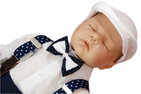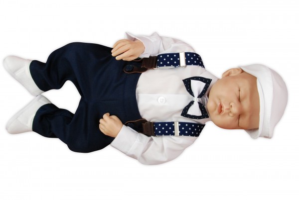 Spodnie fason slim na gumeczce, uszyte z tkaniny 100 % bawełnianej w kolorze granatowym z efektownymi szelkami w kolorze granatowym w białe groszki z zapięciami wykonanymi ze skóry w kolorze brązowym.