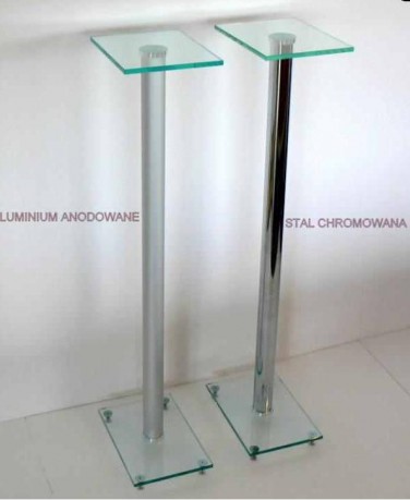 Wykonujemy i sprzedajemy stojaki pod kolumny ze szkła białego, czarnego i przeźroczystego. Stojaki posiadają kloce antywibracyjne w celu uzyskania wysokiej twardości i odporności na drgania, które będą zredukowane i w mniejszym stopniu przenoszone z kolumny na podłogę. Stojak składa się z dwóch półek szklanych: górna 20 × 25 cm i dolna 30 × 25 cm oraz pojedynczej nogi aluminiowej, ze stali chromowanej, z białym lub czarnym matem o wysokości 75 cm. Na indywidualne życzenie klienta możemy także wykonać stojaki w innych wymiarach.