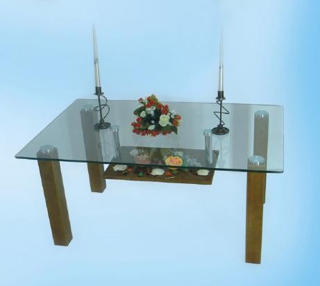 Oferujemy szklany stolik na drewnianych nóżkach bukowych o grubości 7 × 7 cm. Cały stolik ma wymiary 110 × 70 cm i wysokości 50 cm. Pod szklanym blatem znajduje się mała drewniana półka z litego drewna bukowego. Elementy bukowe barwione są na wybrany przez klienta kolor spośród dostępnych wariantów: wenge, orzech jasny, orzech ciemny, wiśnia, rustikal, olcha miodowa lub lakier.