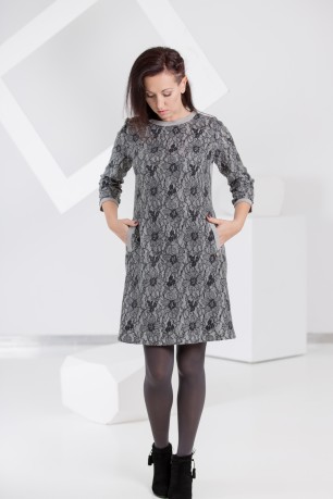 Propozycja dla kobiet wszechstronnych łącząca elegancję z wygodą. Fajna sukienka pod szyję, z kieszeniami, z przodu na szarej dzianinie koronka w odcieniu grafitowym, tył z gładkiej dzianiny w kolorze melanżowej szarości. Sukienka ponadczasowa, uniwersalna, zarówno na spotkanie biznesowe, jak i wieczór z przyjaciółmi.