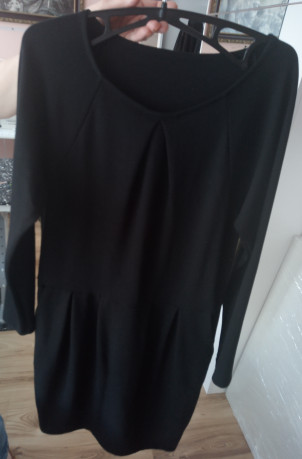Czarna sukienka ze złotym lampasem po bokach.