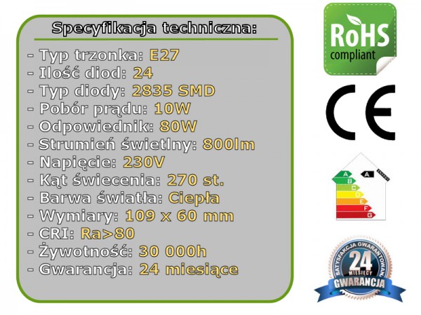 24 diodowa żarówka LED SMD 2835 o mocy 10W, gwint E27. Barwa światła ciepła biała, 800lm.