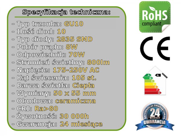 Żarówka LED SMD 2835 o mocy 8W, 800lm, wtyk GU10. Barwa światła ciepła biała.
