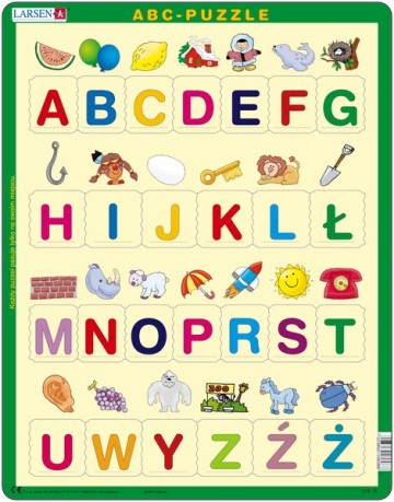 W stałej ramce znajduje się 26 ilustracji a pod nimi 26 elementów z literką alfabetu, która jest pierwszą literą danego wyrazu.
