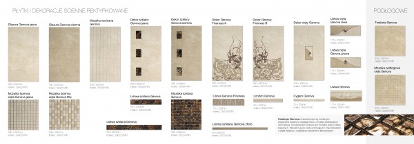 Kolekcja Genova charakteryzuje się subtelnymi przejściami barwnymi ciepłego beżu, od płytki jaśniejszej po ciemniejszą. Uzupełnieniem kolekcji jest mozaika cięta z płytek bazowych oraz dekoracje ze szkła.