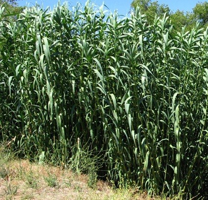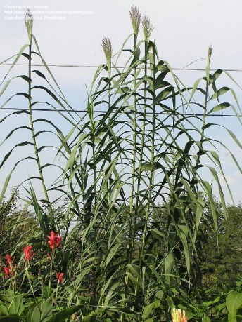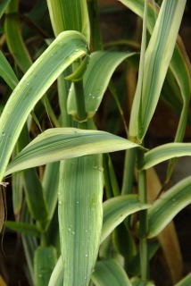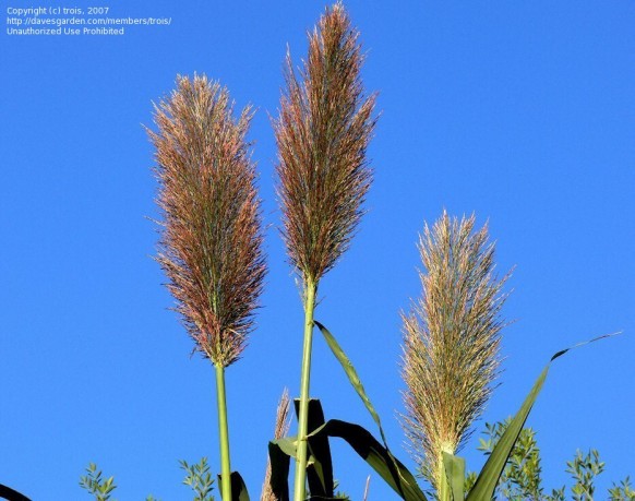 sztywne grube łodygi,olbrzymi kłącza,.Od samgo dołu na dwa boki wyrastające jak u zwykłych trzcin liście tylko olbrzymie.W naszych warunkach potrzeba kilka lat żeby kwitła.