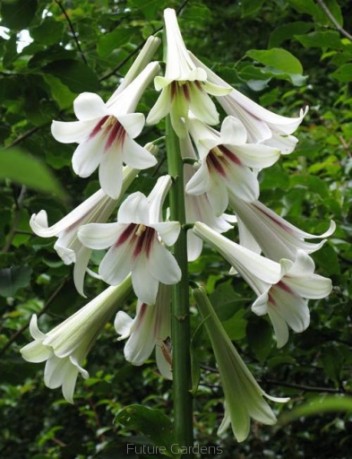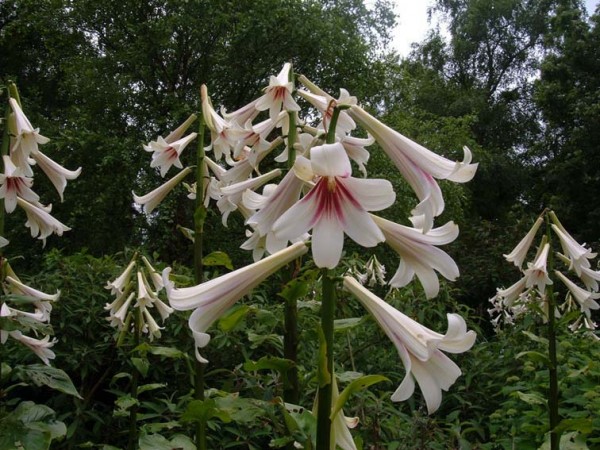 Na grubej łodydze jak u słonecznika ,liście kształtem słonecznikowych ale cienkie i bardzo gładkie .Od połowy łodygi bardzo długie dzwony zwieszone ku dołowi białe w środku różowiejące .Wyjątkowa lilia która żeby zakwitnąć musi mieć cebulę olbrzymią jak nasza głowa i mieć 7 lat ,poczem rodzi kilka drobnych cebul a sama zamiera.na zimę należy obłożyć grubo kompostem.