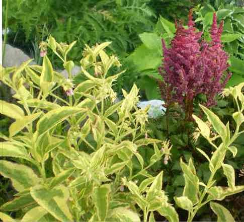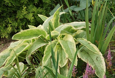 wysoka,liście duże obrzeżone kremowo-biało .bardzo ozdobne z liści mniej z kwiatów wyrastających ze środka -fioletowe dzwoneczki.