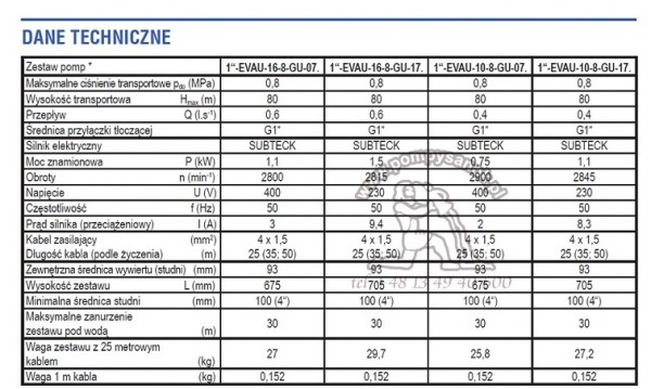 Zanurzeniowe zestawy pomp 1-EVAU są przeznaczone do pompowania wody pitnej i użytkowej do temperatury 35 stopni Celsiusza i kwasowości w zakresie 6,5 - 12 pH. Praktyczne użycie zestawu
