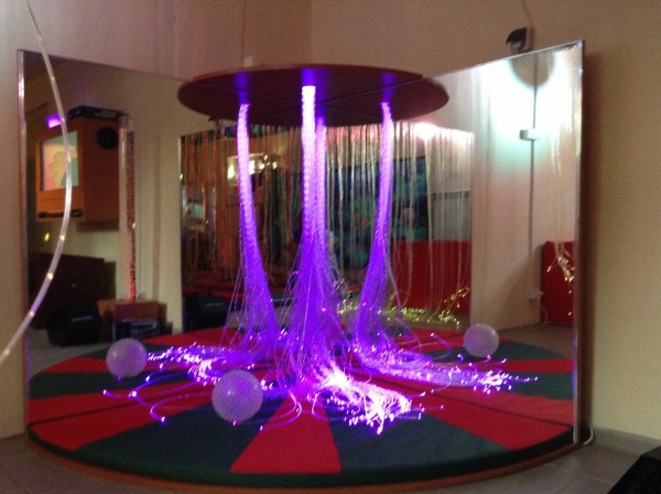 Wyłożony jest lustrami po bocznych ścianach. Lustra te są zupełnie bezpieczne, odporne na ewentualne uderzenia (zamiast lustra szklanego stosuje się akrylowe). Osoba znajdująca się w kąciku , skupia uwagę na samym sobie. Kącik lustrzany podobnie jak wyspa swiatłowodowa składa się z dwóch luster ustawionych prostopadle do siebie .