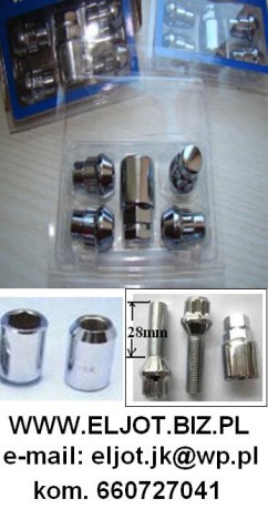 ELJOT.BIZ.PL oferuje: nakrętki zabezpieczające do kół samochodowych, nakrętki zabezpieczające do felg, zabezpieczenia do kół, nakrętki antykradzieżowe, chromowane z kluczem - (4 szt. + klucz uniwersalny 17mm / 19mm), w pudełku plastikowym.