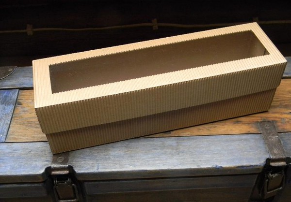 Pudełko na wino, z tektury falistej, z okienkiem. Produkcja ręczna.