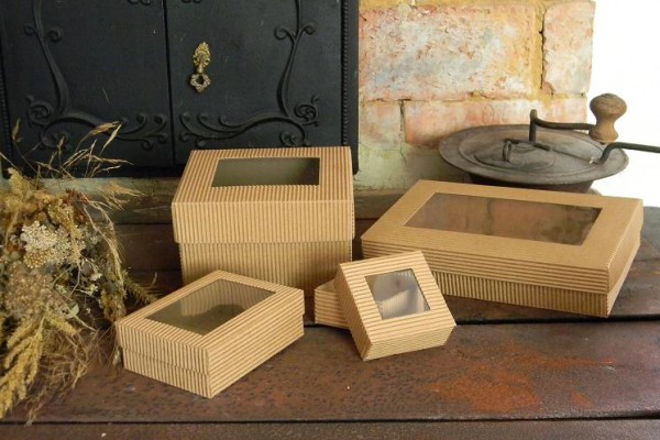 Pudełka z tektury fala E z okienkiem. Produkcja ręczna.