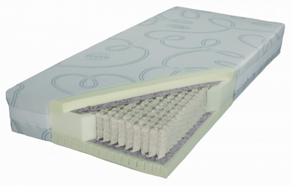 Komfortowy ze sprężyn woreczkowych, z wysokogatunkowego drutu, obłożony jest obustronnie przekładką tapicerską i z jednej strony 50 mm płytą lateksu, a z drugiej strony 50 mm warstwą pianki termoelastycznej.