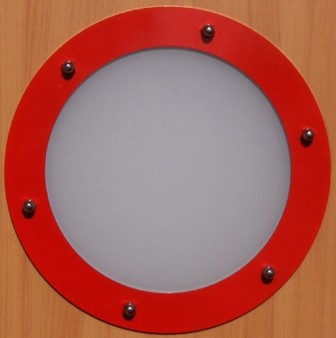 Średnica zewnętrzna metalowego pierścienia to 323 mm. Bulaj ten idealnie pasuje do standardowych rozmiarów drzwi, a odstęp pomiędzy pierścieniami bulaja można łatwo regulować długością prętów gwintowanych. Szyby wykonane są wg życzenia zamawiającego z matowego szkła decormat o grubości 4 mm.