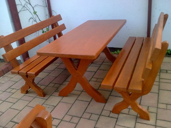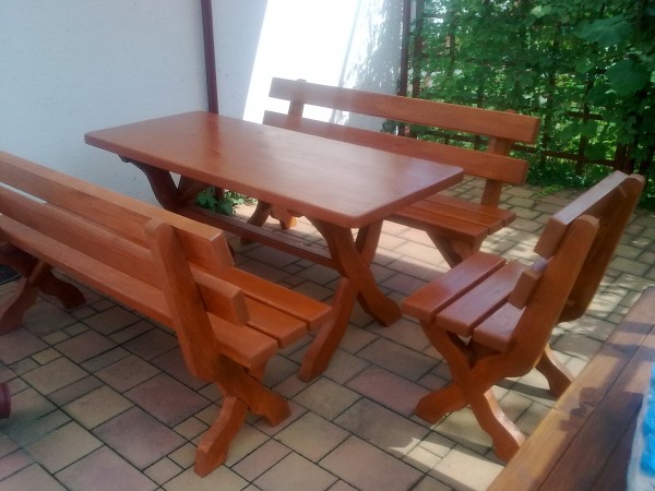 Meble z grupy "ciężkie" w wymiarach ławki 160 cm. a stołu 160 cm. x 70 cm. Konserwacja poprzez 3 - krotne malowanie Sadolinem lub drewnochronem.