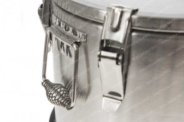We wnęce pokrywki znajduje się bardzo gruba silikonowa uszczelka, która dociskana aż sześcioma wielkimi, mocnymi klamrami zapewnia bezpieczny transport zawartości, bez ryzyka przecieknięcia.