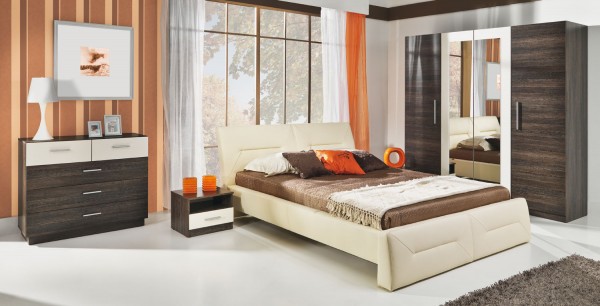 Elementy sypialni ALLESIA - MONTAŻ GRATIS. Korpusy wykonane są z płyty w kolorze arusha wenge a fronty są w kolorze arusha wenge + biały krem. Każdy z elementów sypialni można kupić oddzielnie. Można zamówić łoże z materacem szerokości 160 lub 180 cm lub łoże tapicerowane z materacem szerokości 140, 160 lub 180 cm. Posiadamy duży wybór materacy piankowe, bonelowe, kieszeniowe, w których wkład sprężynowy może być obłożony matą kokosową pokrytą naturalnym lateksem, pianką poliuretanową, owczą wełną czy odpornym na wilgoć włosiem końskim. Do łoża można dobrać szafki nocne, komodę lub szafę z lustrem.