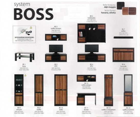 Przykładowe zestawienie elementów - MONTAŻ GRATIS. Kolor korpusu dąb maggia, kolory frontów havana lub oliwka, korpusy i fronty zostały wykonane z płyty laminowanej (gr. 18 mm) o wysokiej trwałości powierzchni, odpornej na zabrudzenia, zarysowania oraz działanie czynników zewnętrznych. Dużo elementów umożliwiających stworzenie interesujących aranżacji m.in. stoliki RTV, półka, szafki wiszące, szafki, regały, witryna, komoda, szafka z lustrem, szafka z wieszakiem, ława.