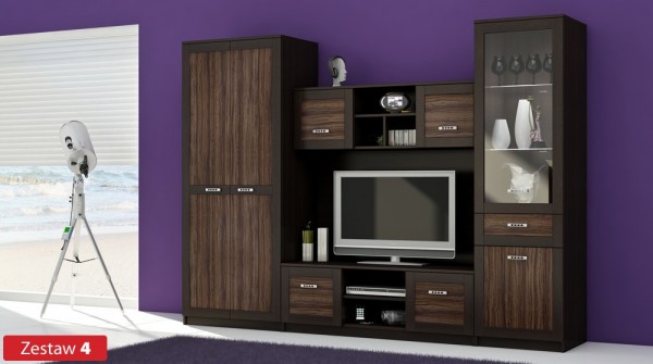 Przykładowe zestawienie elementów - MONTAŻ GRATIS. Kolor korpusu dąb maggia, kolory frontów havana lub oliwka. Dużo elementów umożliwiających stworzenie interesujących aranżacji m.in. stoliki RTV, półka, szafki wiszące, szafki, regały, witryna, komoda, szafka z lustrem, szafka z wieszakiem, ława. Można zamówić oświetlenie typu LED do szklanych półek w witrynie.