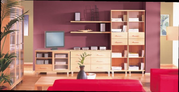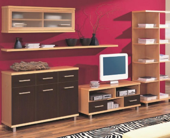 Przykładowe ustawienie elementów - MONTAŻ GRATIS. Kolor korpusu klon luzern, kolor frontu klon luzern lub dąb amari. Dużo elementów pozwalających na wiele aranżacji m.in. komody, szafy, witryny, stoliki RTV, łóżka, biurka, półki. Płyta melaminowana o gr 18 i 22 mm.