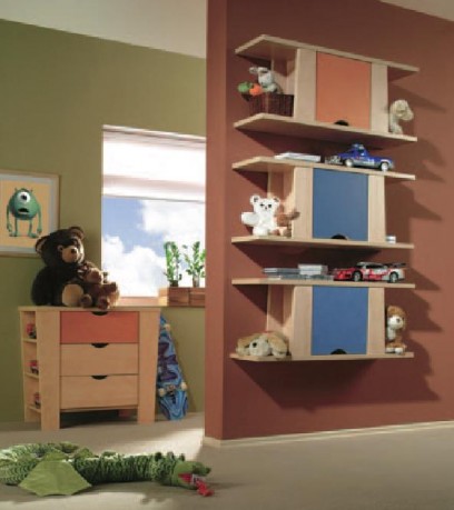 Przkładowy zestaw mebli - MONTAŻ GRATIS. Kolor korpusu grusza dzika, kolor frontu grusza dzika+terra łosoś lub terra niebieska. Oryginalny system mebli dla dzieci, wiele elementów m.in. łózko piętrowe z biurkiem i szafą, regały, komody, półki itd.