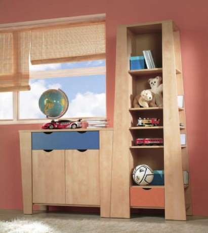 Przykładowy zestaw mebli - MONTAŻ GRATIS. Kolor korpusu grusza dzika, kolor frontu grusza dzika+terra łosoś lub terra niebieska. Oryginalny system mebli dla dzieci, wiele elementów m.in. łózko piętrowe z biurkiem i szafą, regały, komody, półki itd. Można stworzyć wiele oryginalnych aranżacji do dziecinnego i młodzieżowego pokoju.