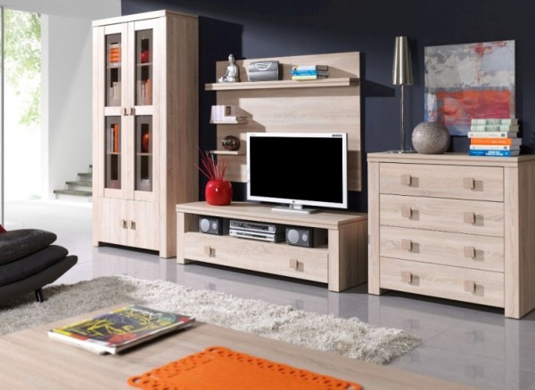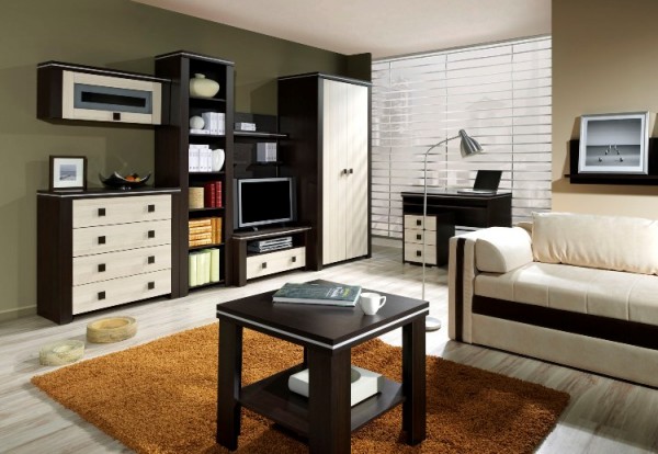 Przykładowy zestaw elementów - MONTAŻ GRATIS. Możliwości kolorystyczne: kolor korpusów i frontów: dąb sonoma lub kolor korpusów wenge a kolor frontów: jesion lub oliva. System wykonany z płyty wiórowej melaminowanej o grubości 18 mm i 22 mm. Meble skonstruowane modułowo sprawdzają się w małych przestrzeniach. Wielkość i rozmaitość brył pozwalają na stworzenie indywidualnych kompozycji dopasowanych do kształtu i wielkości urządzanego pokoju.
